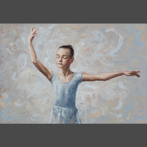 A bright and cosy painting of a little ballerina performing an improvised dance in her ballet class. Painted with loose, impressionist-style brushstrokes. Suitable for bright spaces or the children’s room.